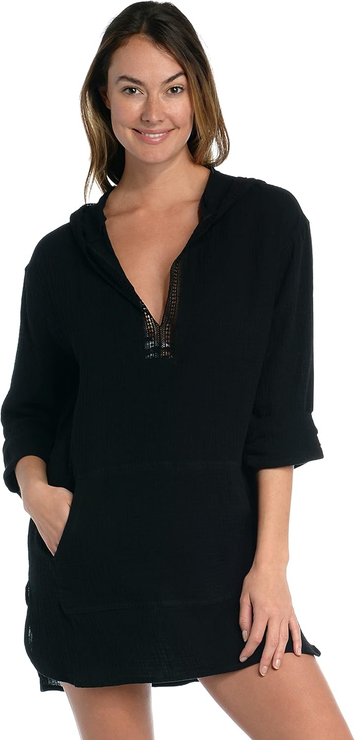 48% Rayon, 48% Polyester, 4% Elastane Imported Pull On closure Hand Wash Only DRAWSTRING BEACH HOODIE: Taking its cue from your favorite hoodie, this knitted version will become your go-to favorite to and from the beach. Long sleeves and a just-right length provide the perfect amount of cover from the sun and the drawstring hood comes in handy when the temperatures dip after sunset INCREDIBLY COMFY: A loose fit and soft, knitted fabric will make this cover-up your go-to fave SOLID HUE: Versatile color mixes and matches effortlessly with patterns and other solid colors