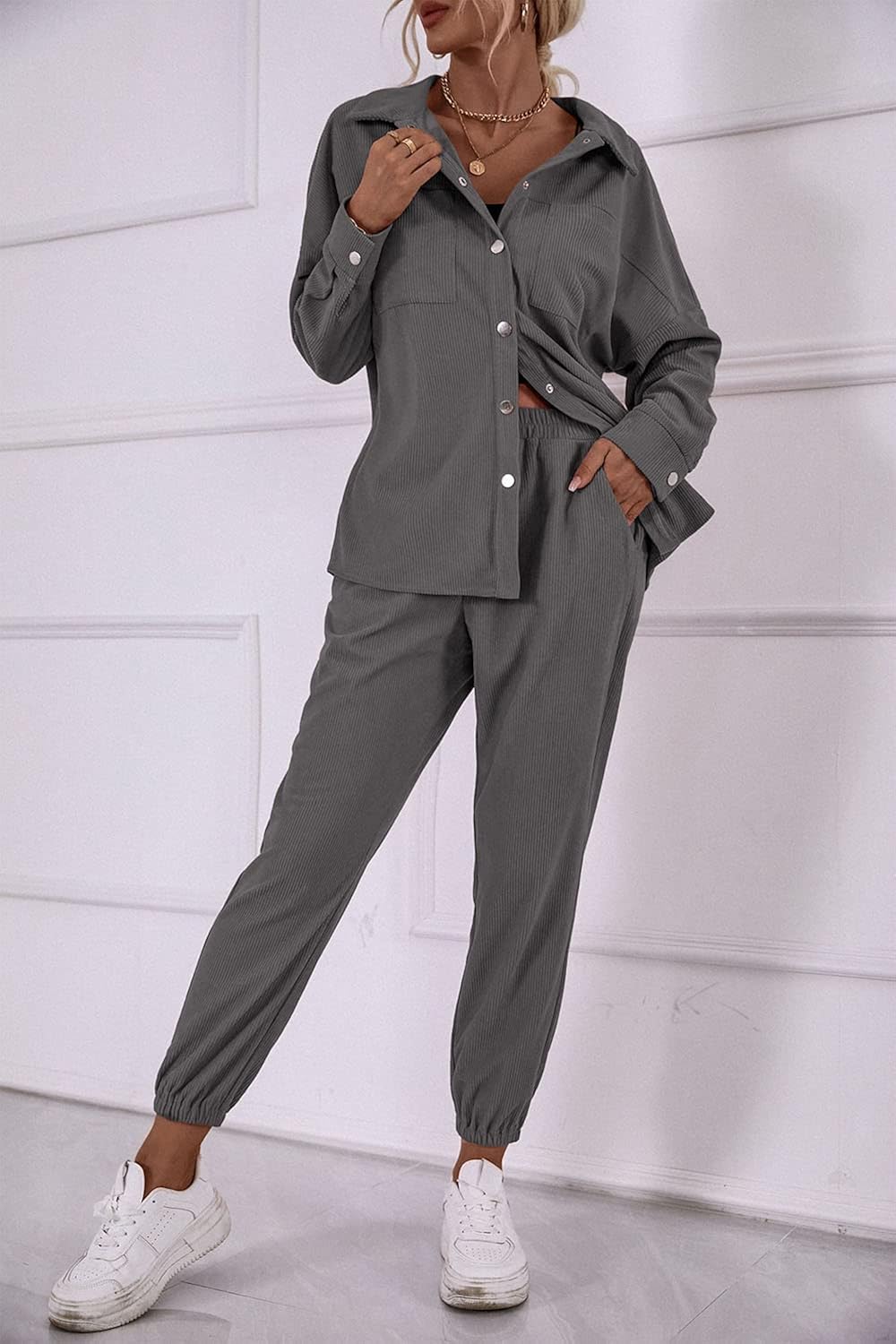 CASUAL TRACKSUIT SETS FOR WOMEN! The Long Sleeve Top Features A Collar, Bust Pocket And Front Button Down Closure, Elastic Wait Design Is Suitable For Any Body Shape. Two Piece Corduroy Tracksuit Set Keeps You Warm And Comfy All Day Long. It's Perfect For Lounge Wear, Running Errands, Going Outside, Hanging Out, Streetwear, Running, Jogging, Walking Any Indoor And Outdoor Activities COLOR OPTIONS: Black Long Pants Sweat Sets/ Brown Two Piece Outfits/ Green Comfy Loungewear Sets/ Grey Womens Tracksuit/ Navy Jogging Outfits For Women/ Pink Travel Outfits/ Red Brown Casual Outfits For Women/ Wine Red Tracksuit For Women Show more