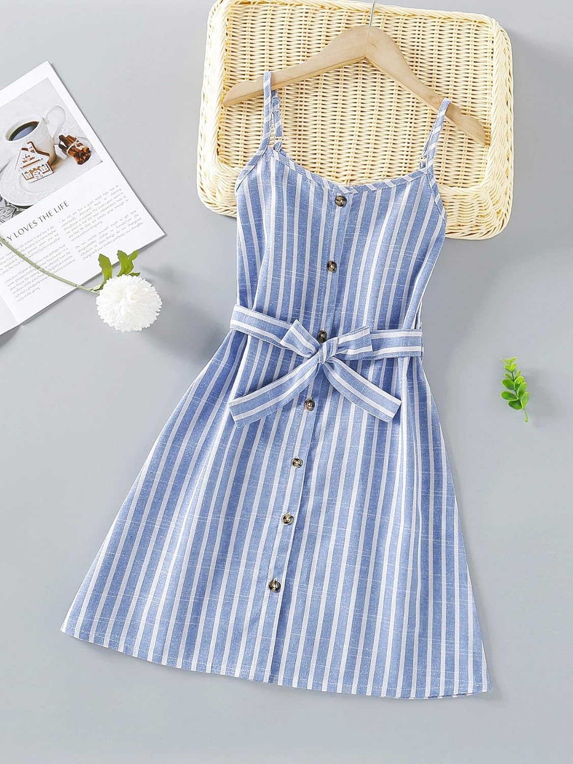 100% Polyester Imported Button closure Hand Wash Only Fabric has no stretch, soft and comfy Striped, button decor, adjustable strap, belted, a line dress Great for daily wear, vacation, school, artistic photo shoot, family gathering