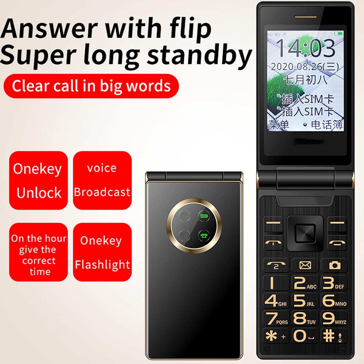Large Screen: 2.8in screen, the color reproduction is more lifelike, the display effect is high definition and high resolution, the screen is clear and delicate, catch the wonderful moments in life, record the details with family and friends, and feel the moments of a happy life. Shaft: The flip phone is not easy to use, and the shaft is the key. It is made of zinc alloy, which is durable. Prominent Buttons: This phone is easy to use and easy to understand at a glance, the prominent buttons, custom keys are clearly visible in font. One Touch Dial: One touch home number, convenient and practical, the elderly no longer need to look at the phone book, convenient and fast. Clear Sound Quality: For clearer sound quality, use the speaker, the independent large receiver is used for the independent speaker, the sound is clearer and brighter, parents will not pass up every call and listen to every greeting and blessing.