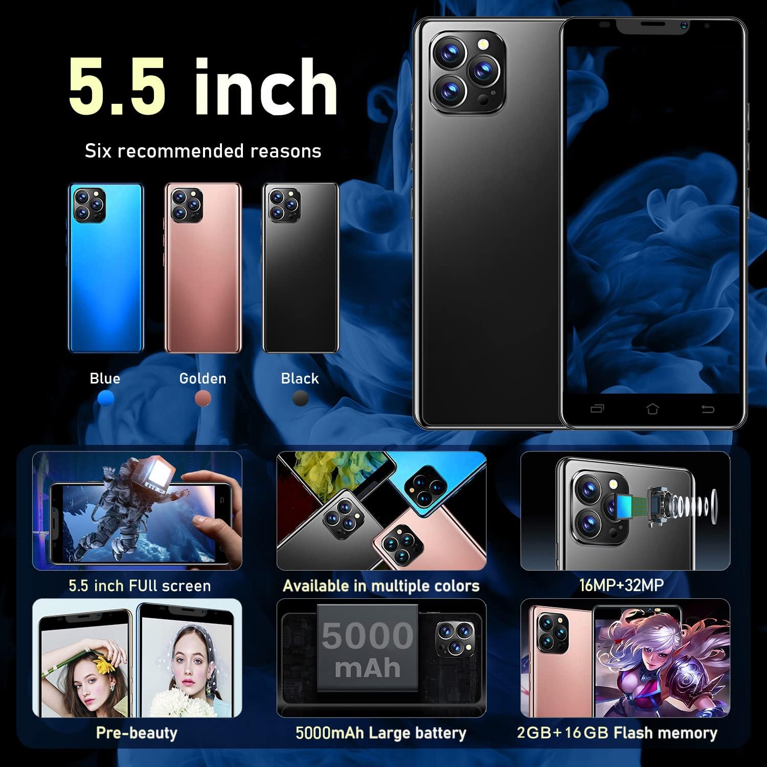 About this item 【Full Screen & 16MP+32MP HD Dual Camera】The 5.5-inch high-definition full-fit water drop screen allows you to experience a broader field of view. Small size fits your palm better. Front and rear cameras, vivid colors, every photo is as beautiful as wallpaper. Shoot beautiful portraits, stunning landscapes and clear close-up shots in any light 【Android 10.0, 2GB RAM+ 16GB ROM, SD up to 128GB】The latest upgraded OS Android 10 cheap phones brings more friendly features for the intuitive visuals and smooth controls, it also further strengthens the protection of your privacy.You also could use a SD card to extend the memory to satisfy your productivity and entertainment needs. 【Real 5.5inch HD Full Screen】Android phone unlocked with 5.5 Inch screen allows you to experience a wider field of view,showing more content in games and videos,The wide screen view and the high color reproduction make the screen look very clear and the fine quality is better. 【MTK6572 CPU+5000mAh Battery】Tmobile cell phones with powerful processor and long-lasting battery greatly improved network, runtime speed, frame rate and image smoothness when playing large games and multitasking. 【Gift For Children or the Old People】Design is an endless journey of pursuing beauty, and everything can be the spark of new inspirations. S22 Ultra cell phone interprets the color aesthetics in life from the splendid nature scenes to the whimsical imaginations with four invigorating hues. This android unlocked smartphone has all the features to cater to adults, elderly as well as children.