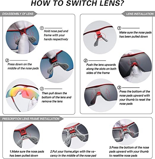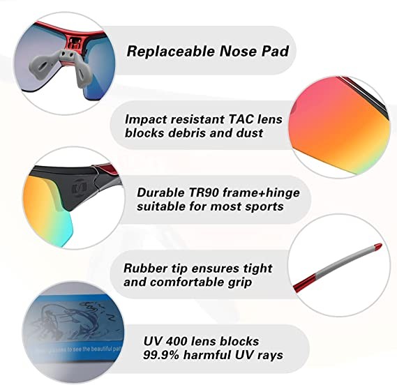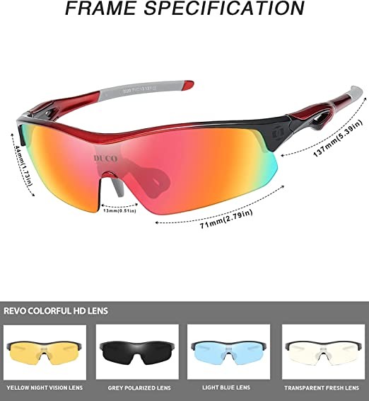 1* Sport Glasses Frame 、5* Lenses(The Gray Lens is Polarized) 、1* Hard Protection Box 、1* Glasses Bag 、1* Cleaning Cloth