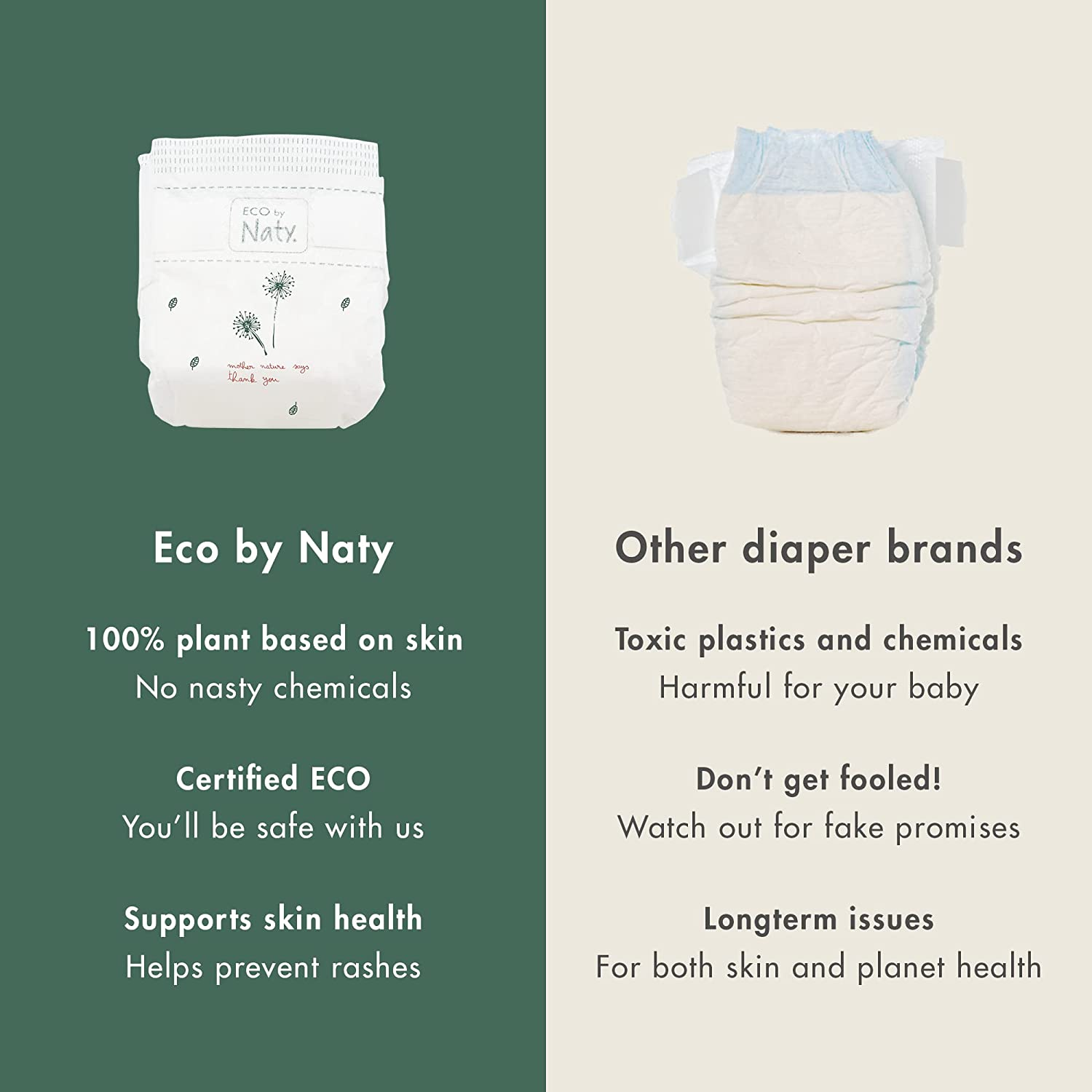 ECO-FRIENDLY AND COMPOSTABLE: Traditional disposable diapers are often made with toxic plastics. Naty Eco Diapers are mostly made from certified plant based materials like sugar cane, corn, woodpulp and cotton which makes them natural, absorbent, and remarkably soft. Sizes available include newborn diapers up to size 6 diapers.