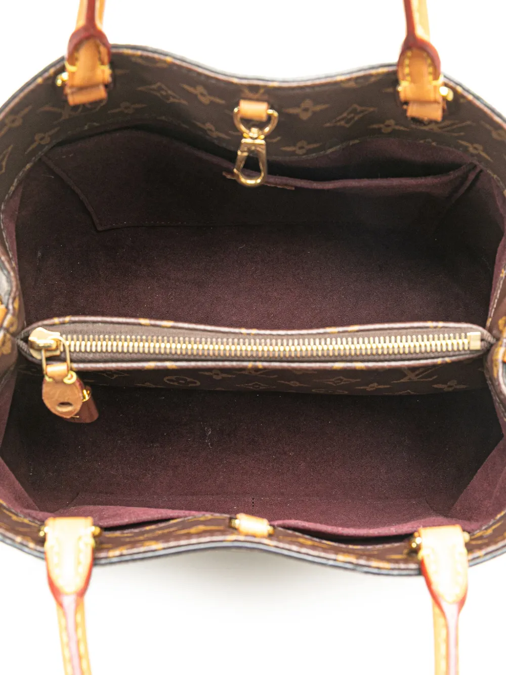 detachable monogram canvas shoulder strap. an open top with a lobster clasp closure